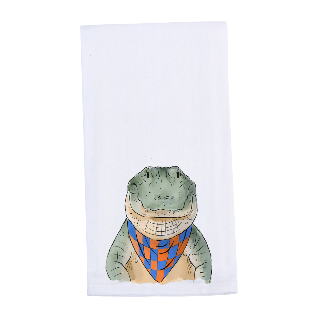 This orange and blue alligator front tea towel adds a splash of Florida tradition to your kitchen. Featuring a vibrant alligator design in bold orange and blue, it’s perfect for bringing Florida pride into your home!