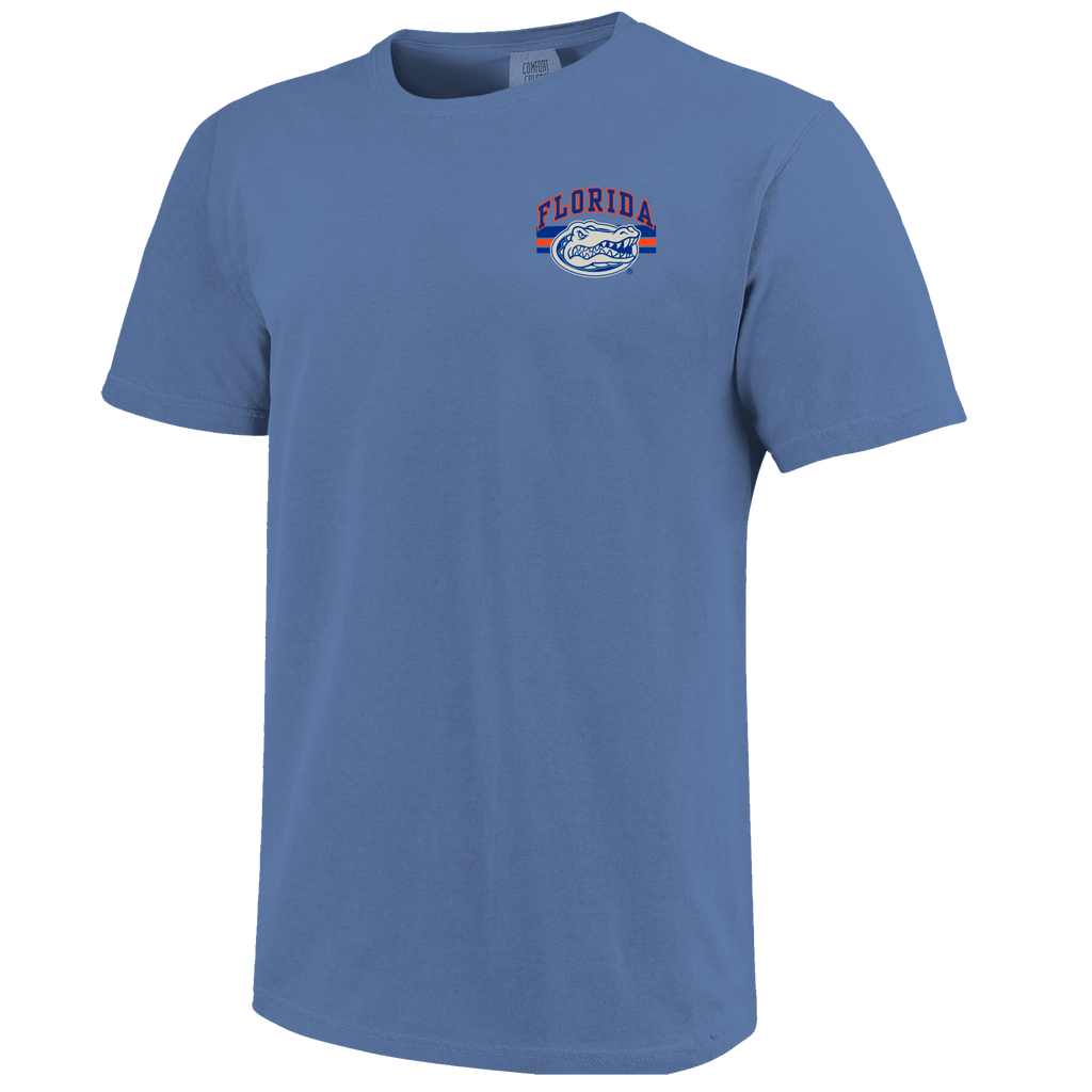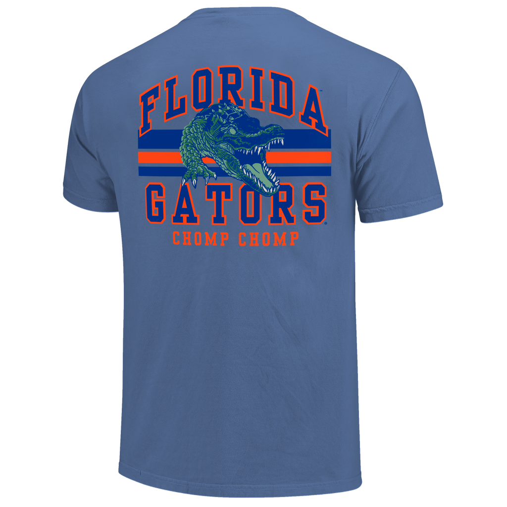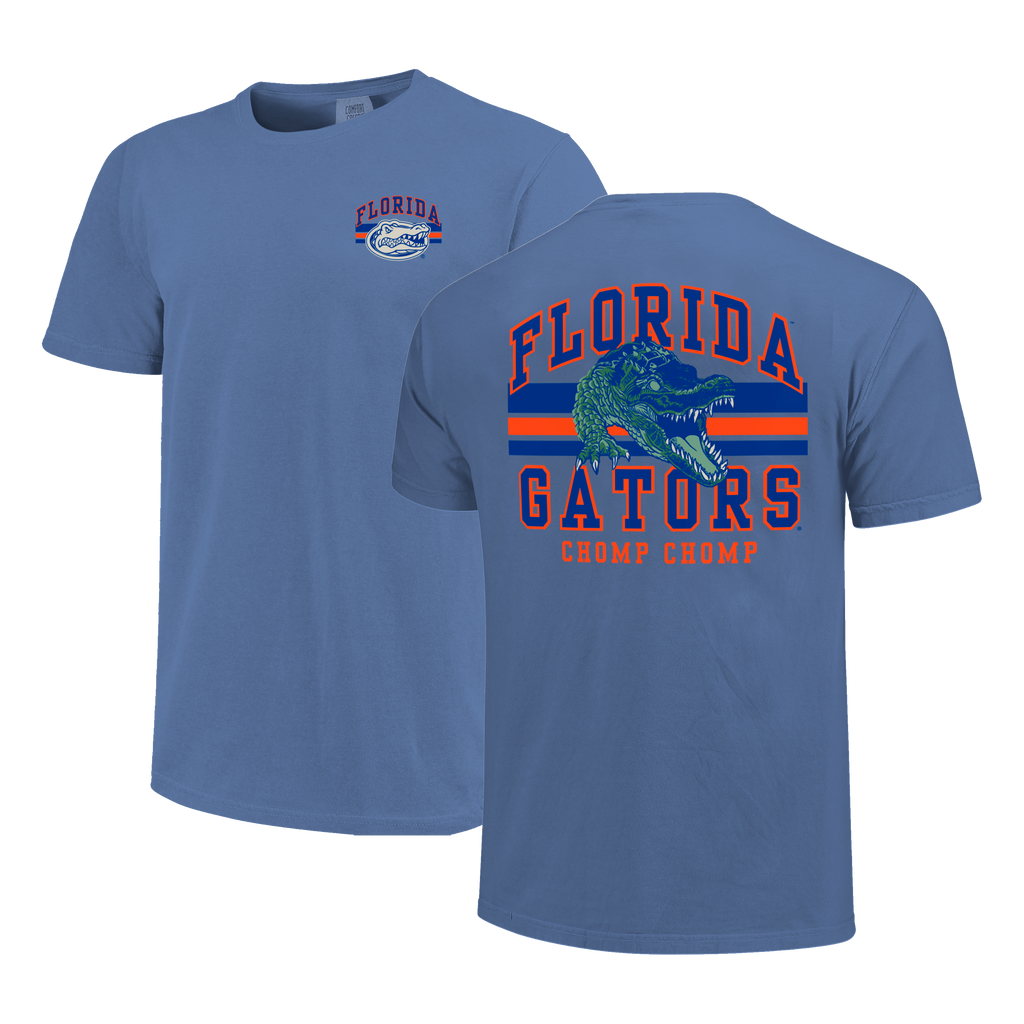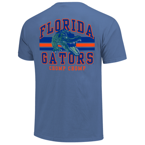 A blue distressed heavy cotton tee with a gator on the back of the tee and "FLORIDA GATORS" & "CHOMP CHOMP" placed around the Gator. On the front left chest is a Florida Gator head logo and "FLORIDA" .