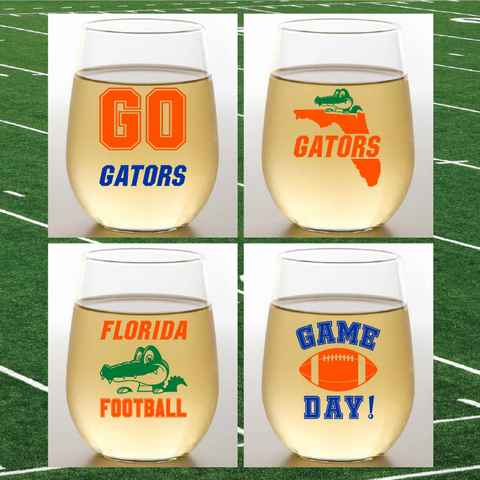 16 oz. Shatterproof Stemless Wine Tumblers - Made with the highest quality, crystal clear, BPA-free Tritan Plastic– Lightweight – Recyclable – Reusable – Dishwasher Safe. This 4-pack is packaged in eye-catching color-coordinating mesh bags tied with a wine cork, Each tumbler features Florida Gator catch phrases in Gator colors.